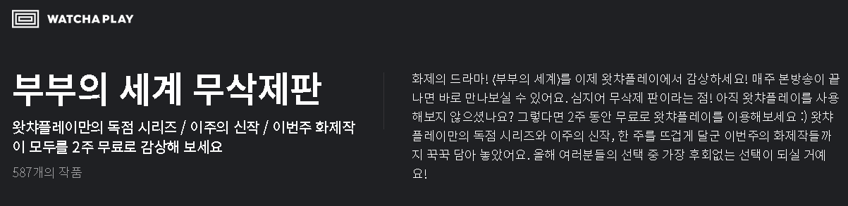 현재 왓챠플레이에서 부부의세계 무삭제판을 무료로 감상이 가능합니다. 가입과 동시에 2주동안 OTT서비스를 무료로 이용할 수 있기에 굉장히 효율적 입니다.